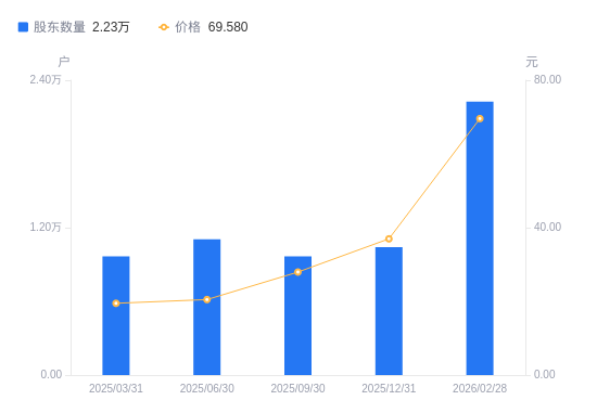 3月31日消息,数据显示,截至2026年2月28日,联德股份A股股东总户数为2.23万户,较上期(2025年12月31日)增加1.19万户,增幅114.00%。公司最新A股总股本为2.41亿股,其中流通A股2.39亿股,户均持有流通A股数量为1.07万股,较上期减少1.22万股,降幅53.27%;户均持流通A股市值74.69万元,较上期减少10.21万元,降幅12.03%。
