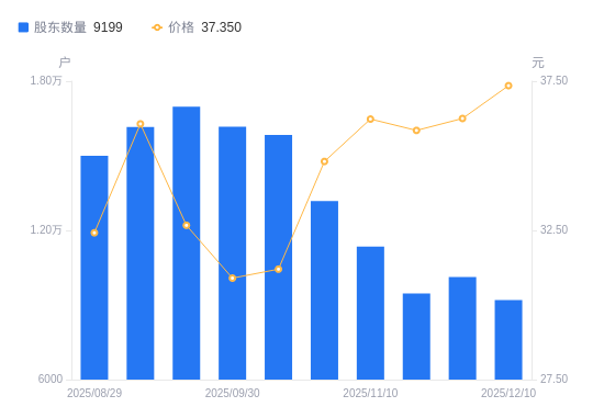近一年(2024年12月10日至2025年12月10日),共创草坪A股股东户数从9920户,减低至9199户,降幅7.27%,区间股价上涨96.99%。