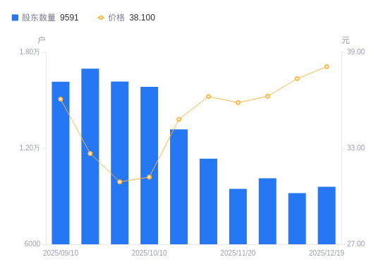 近一年(2024年12月20日至2025年12月19日),共创草坪A股股东户数从1.19万户,减低至9591户,降幅19.25%,区间股价上涨74.69%。