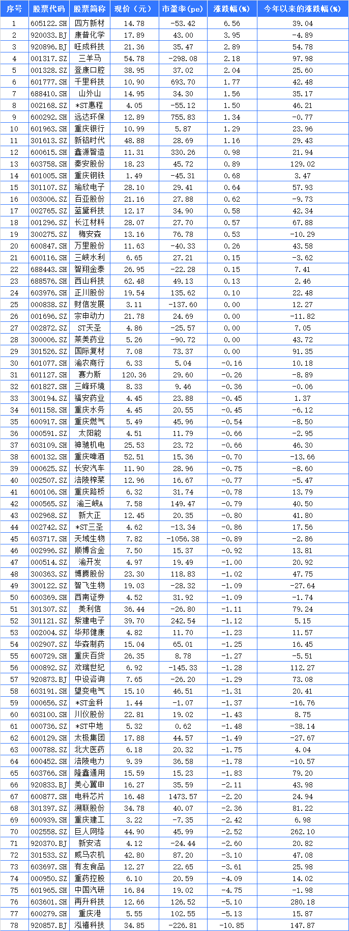 下跌渝股有49家,泓禧科技、重庆港和再升科技分别以-10.85%、-5.13%和-5.10%,列涨幅最后三位。