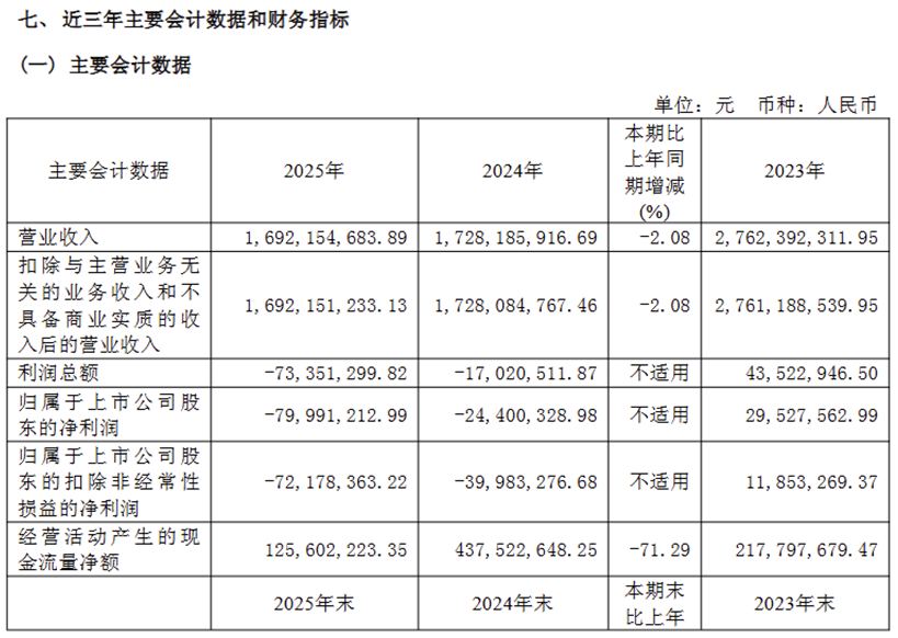 2026年3月27日晚,公司正式披露2025年年度报告,相较于1月21日发布的业绩预告,最终的亏损数据更显触目惊心——全年实现营业收入16.92亿元,同比下降2.08%;归母净亏损定格在7999.12万元,逼近预告上限,扣非后净亏损7217.84万元,较上年同期亏损幅度大幅扩大,公司同时宣布2025年度拟不派发现金红利,不以资本公积转增股本。