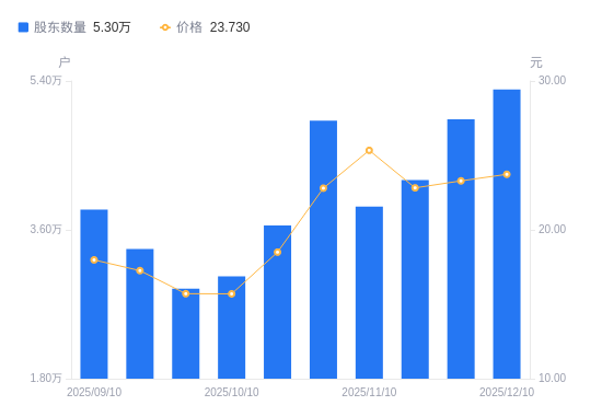 近一年(2024年12月31日至2025年12月10日),国光连锁A股股东户数从1.52万户,增加至5.3万户,增幅248.00%,区间股价上涨209.79%。