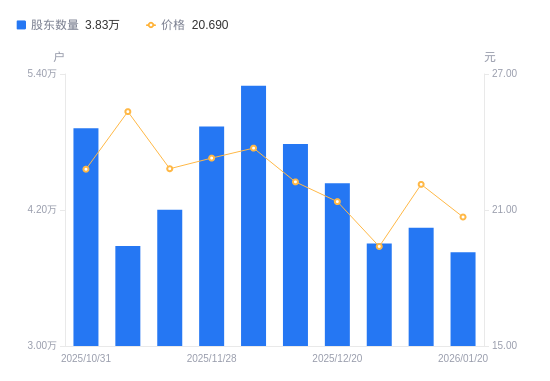 1月21日消息,数据显示,截至2026年1月20日,国光连锁A股股东总户数为3.83万户,较上期(2026年1月10日)减少2149户,降幅5.32%。公司最新A股总股本为5.02亿股,其中流通A股5.02亿股,户均持有流通A股数量为1.31万股,较上期增加697.78股,增幅5.61%;户均持流通A股市值27.16万元,较上期减少3458.62元,降幅1.26%。