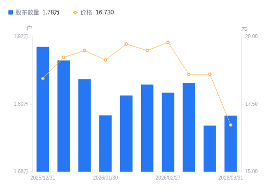 4月1日消息,数据显示,截至2026年3月31日,伟时电子A股股东总户数为1.78万户,较上期(2026年3月20日)增加180户,增幅1.02%。公司最新A股总股本为2.43亿股,其中流通A股2.13亿股,户均持有流通A股数量为1.2万股,较上期减少122.18股,降幅1.01%;户均持流通A股市值20.01万元,较上期减少2.48万元,降幅11.01%。