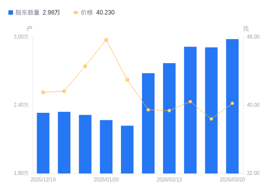 近一年(2025年3月20日至2026年3月20日),中际联合A股股东户数从1.39万户,增加至2.98万户,增幅115.11%,区间股价上涨49.94%。
