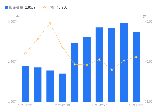 4月2日消息,数据显示,截至2026年3月31日,中际联合A股股东总户数为2.85万户,较上期(2026年3月20日)减少1333户,降幅4.47%。公司最新A股总股本为2.13亿股,其中流通A股2.13亿股,户均持有流通A股数量为7457.89股,较上期增加333.28股,增幅4.68%;户均持流通A股市值30.53万元,较上期增加1.86万元,增幅6.50%。