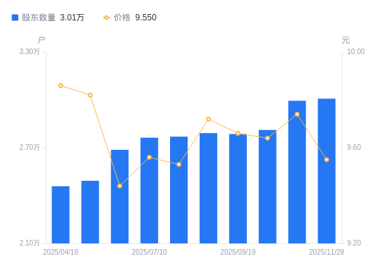 近一年(2024年12月20日至2025年11月28日),蓝天燃气A股股东户数从2.36万户,增加至3.01万户,增幅27.20%,区间股价下跌8.96%。