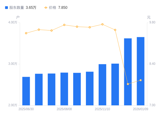1月12日消息,数据显示,截至2026年1月9日,蓝天燃气A股股东总户数为3.65万户,较上期(2025年12月31日)增加299户,增幅0.83%。公司最新A股总股本为7.15亿股,其中流通A股7.15亿股,户均持有流通A股数量为1.96万股,较上期减少161.88股,降幅0.82%;户均持流通A股市值15.38万元,较上期增加1296.88元,增幅0.85%。