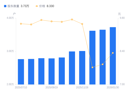 近一年(2025年2月28日至2026年1月30日),蓝天燃气A股股东户数从2.49万户,增加至3.73万户,增幅49.88%,区间股价下跌12.59%。