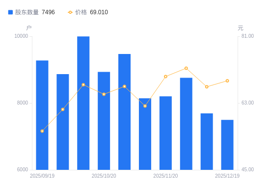 近一年(2024年12月20日至2025年12月19日),长龄液压A股股东户数从9857户,减低至7496户,降幅23.95%,区间股价上涨174.18%。