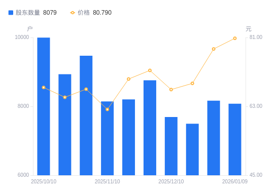 1月12日消息,数据显示,截至2026年1月9日,长龄液压A股股东总户数为8079户,较上期(2025年12月31日)减少88户,降幅1.08%。公司最新A股总股本为1.44亿股,其中流通A股1.36亿股,户均持有流通A股数量为1.69万股,较上期增加181.74股,增幅1.09%;户均持流通A股市值136.27万元,较上期增加6.12万元,增幅4.71%。