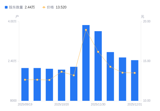 近一年(2024年12月31日至2025年12月31日),晨光新材A股股东户数从2.11万户,增加至2.44万户,增幅15.58%,区间股价上涨13.23%。