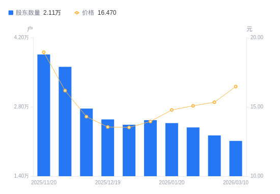 近一年(2025年3月10日至2026年3月10日),晨光新材A股股东户数从2.1万户,增加至2.11万户,增幅0.38%,区间股价上涨41.62%。