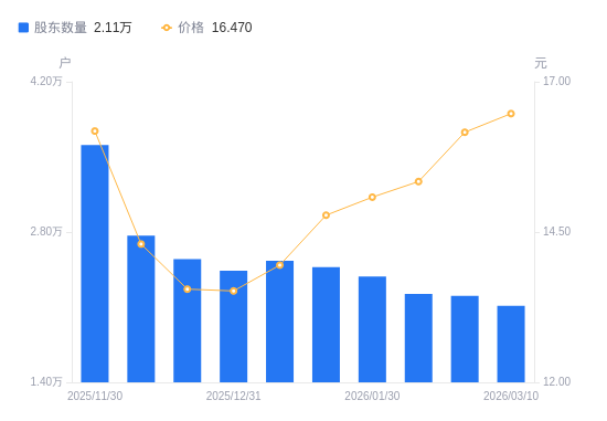 近一年(2025年2月28日至2026年2月28日),晨光新材A股股东户数从2.11万户,增加至2.21万户,增幅4.55%,区间股价上涨40.77%。