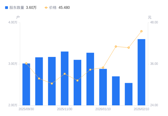 近一年(2025年2月28日至2026年2月10日),福莱新材A股股东户数从2.41万户,增加至3.6万户,增幅49.32%,区间股价上涨29.36%。