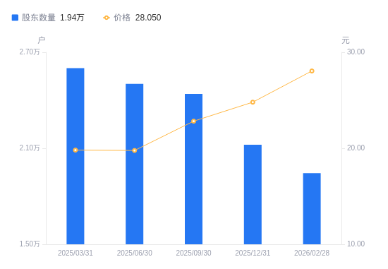 近一年(2025年2月28日至2026年2月28日),国邦医药A股股东户数从2.46万户,减低至1.94万户,降幅20.90%,区间股价上涨47.79%。
