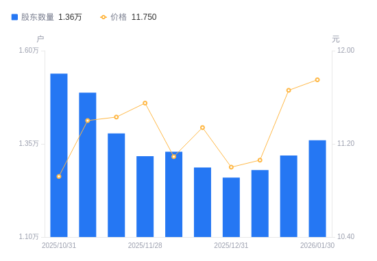 近一年(2025年2月20日至2026年1月30日),春雪食品A股股东户数从1.65万户,减低至1.36万户,降幅17.47%,区间股价上涨36.79%。