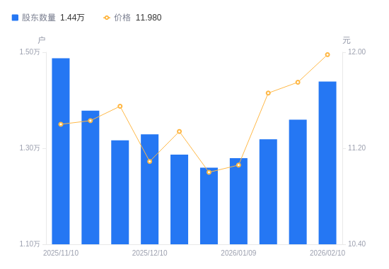近一年(2025年2月20日至2026年2月10日),春雪食品A股股东户数从1.65万户,减低至1.44万户,降幅12.65%,区间股价上涨39.46%。