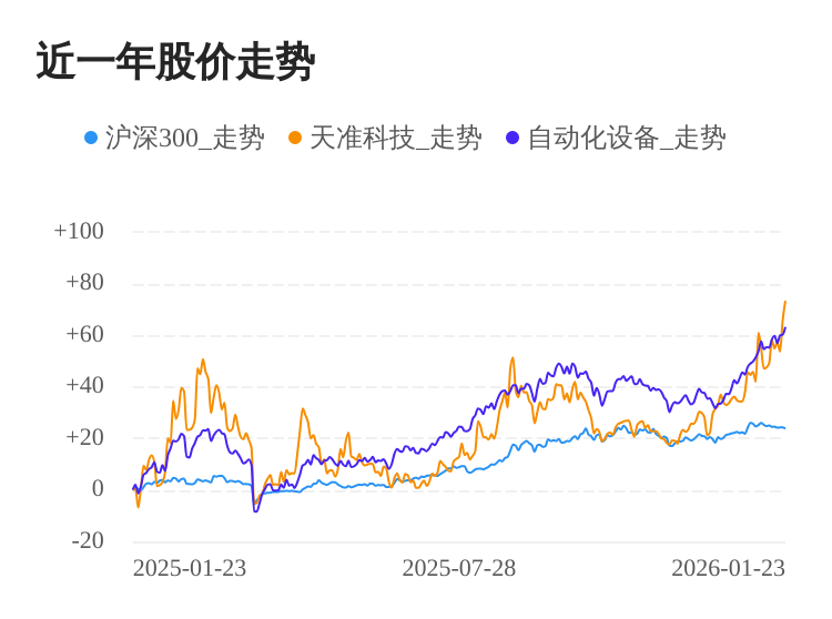 01月23日,天准科技股价继续上涨。截至今日收盘,天准科技上涨4.51%,收盘价为74.08元,盘中股价最高触及75.27元,股价创历史新高。