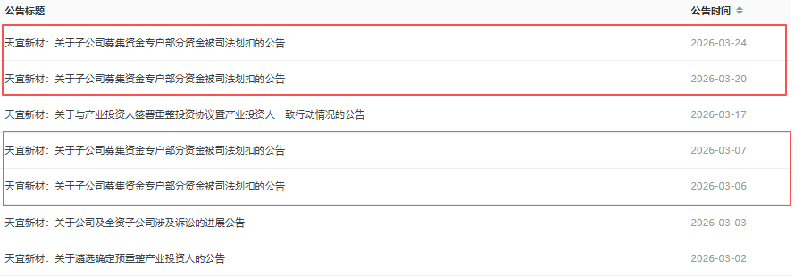 3月23日,天宜新材公告称,子公司募集资金专户部分资金被司法划扣。