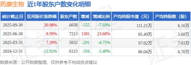 从股价来看,2025年6月30日至2025年9月30日,药康生物区间涨幅为20.98%,在此期间股东户数减少555.0户,减幅为7.69%。