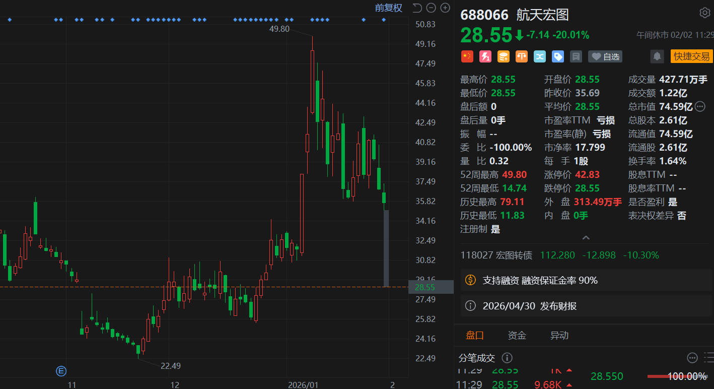 航天宏图(688066.SH)一字板跌停,目前封单金额高达5.29亿元,报28.55元,总市值74.6亿元。消息上,航天宏图上周五盘后公告称,经初步测算,预计2025年净利润为-10.30亿元,扣非净利润-10.80亿元左右,期末净资产为-2.80亿元左右。因审计未完结,数据存在不确定性,若期末净资产为负,公司将可能在2025年年报披露后被实施退市风险警示。