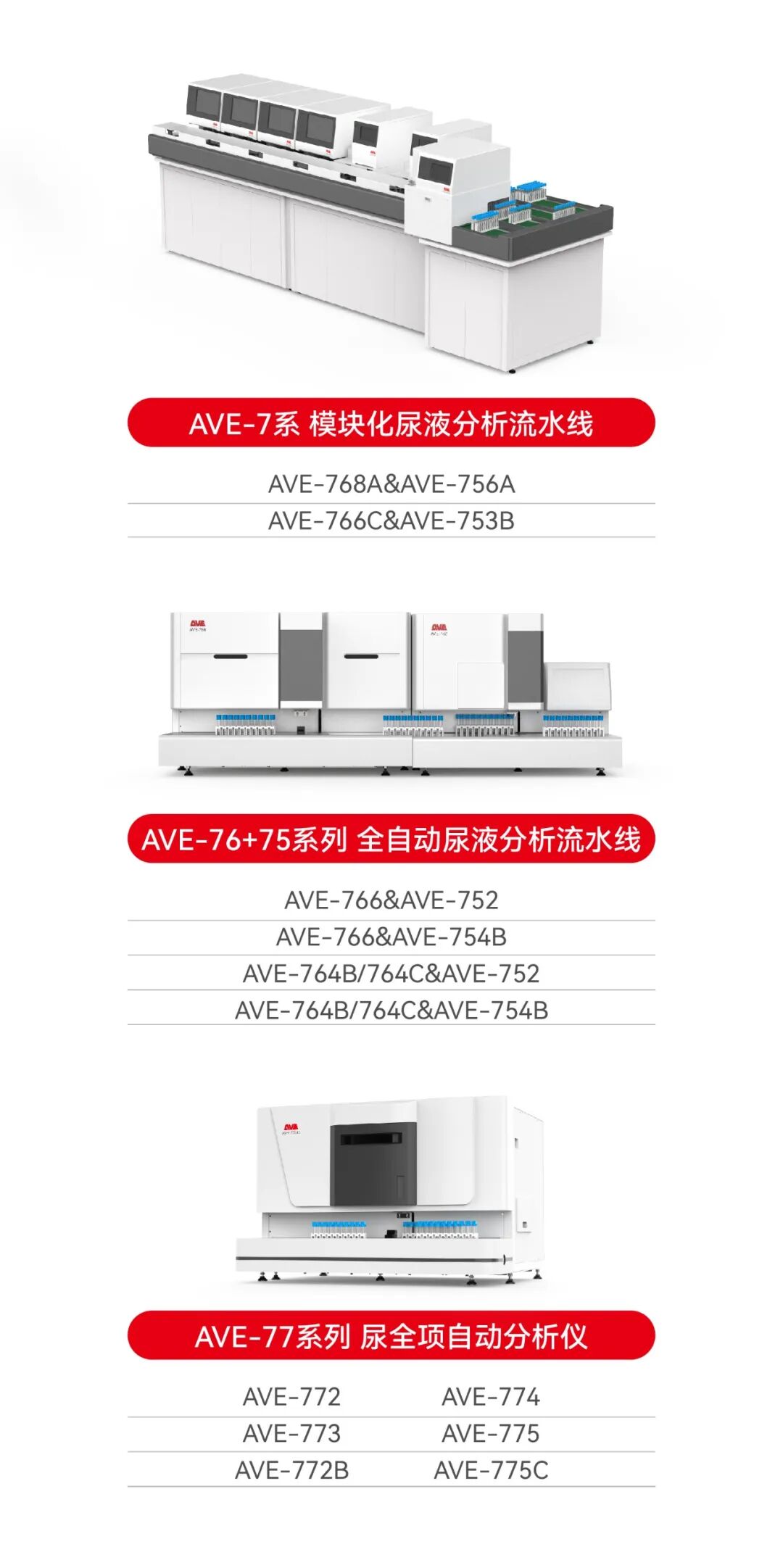 此次入选的AVE系列产品阵容强大,涵盖AVE-76系列尿液有形成分分析仪、AVE-75系列全自动尿液干化学分析仪、AVE-7系模块化尿液分析流水线、AVE-77系列尿全项自动分析仪四大产品线,共14个型号组合入选,成为本次入选型号最丰富的品牌。具体型号包括: