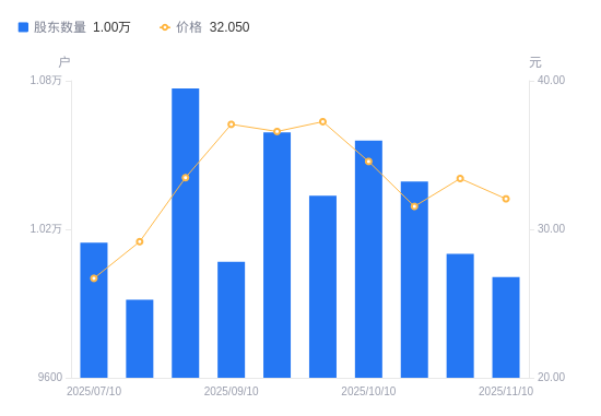 近一年(2024年12月20日至2025年11月10日),博众精工A股股东户数从9779户,增加至1万户,增幅2.33%,区间股价上涨16.60%。