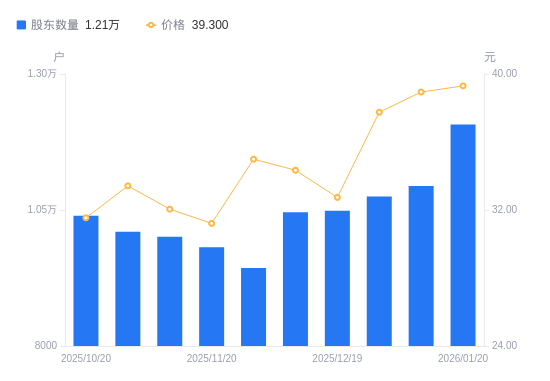 近一年(2025年1月20日至2026年1月20日),博众精工A股股东户数从8315户,增加至1.21万户,增幅45.16%,区间股价上涨44.45%。