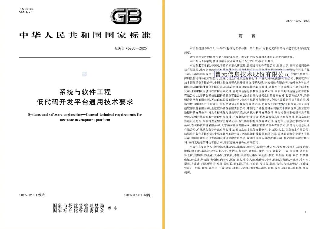 近日,我国首个低代码国家标准《系统与软件工程 低代码开发平台通用技术要求》(GB/T 46900 - 2025),由国家市场监督管理总局正式批准发布。普元信息作为核心起草单位,深度参与了国家标准的制定全过程:不仅贡献了前瞻的技术智慧,更将多年来服务于大型企业的实战经验融入标准,助推行业规范发展。