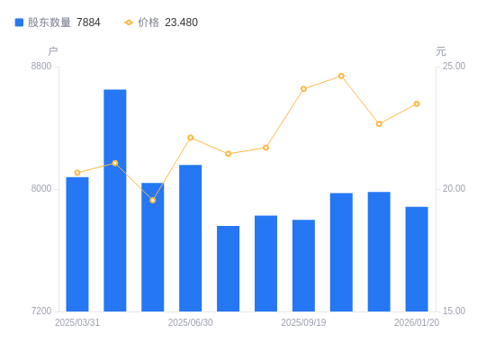 1月27日消息,数据显示,截至2026年1月20日,晶华微A股股东总户数为7884户,较上期(2025年11月10日)减少97户,降幅1.22%。公司最新A股总股本为1.21亿股,其中流通A股6028.51万股,户均持有流通A股数量为7646.51股,较上期增加92.93股,增幅1.23%;户均持流通A股市值17.95万元,较上期增加8376.04元,增幅4.89%。