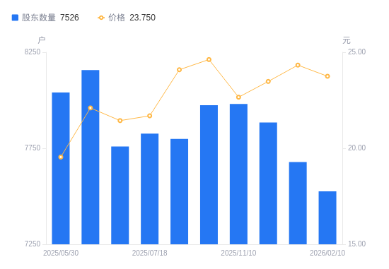 近一年(2025年3月10日至2026年2月10日),晶华微A股股东户数从7937户,减低至7526户,降幅5.18%,区间股价上涨11.18%。