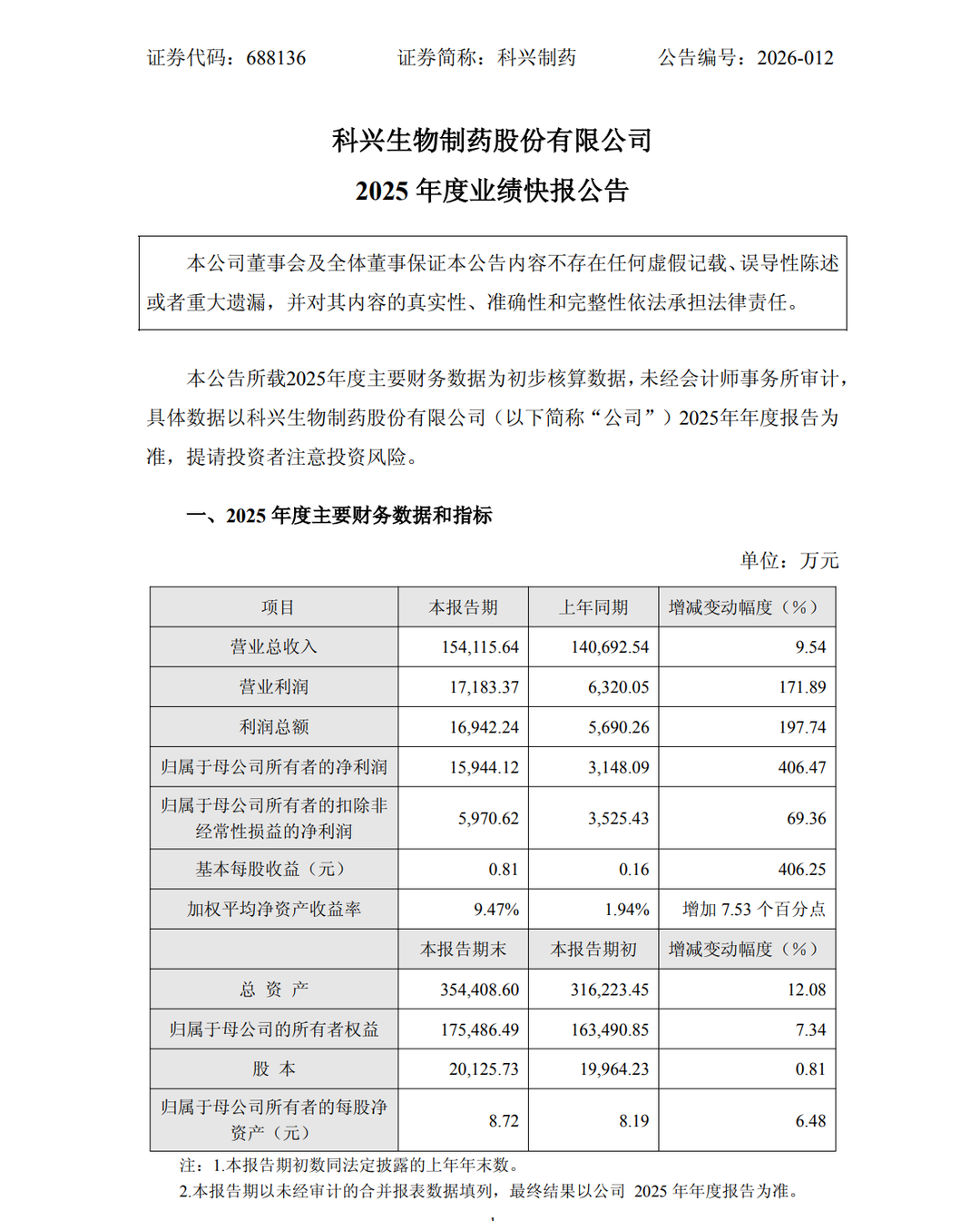 近日,科兴制药(688136.SH)披露的业绩快报显示,2025年,公司实现营业收入15.41亿元,同比增长9.54%;归母净利润1.59亿元,同比大增406.47%;扣非归母净利润为5970.62万元,同比增长69.36%。
