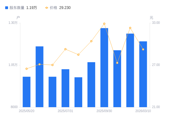近一年(2025年3月20日至2026年3月10日),清溢光电A股股东户数从9674户,增加至1.19万户,增幅23.07%,区间股价上涨8.22%。