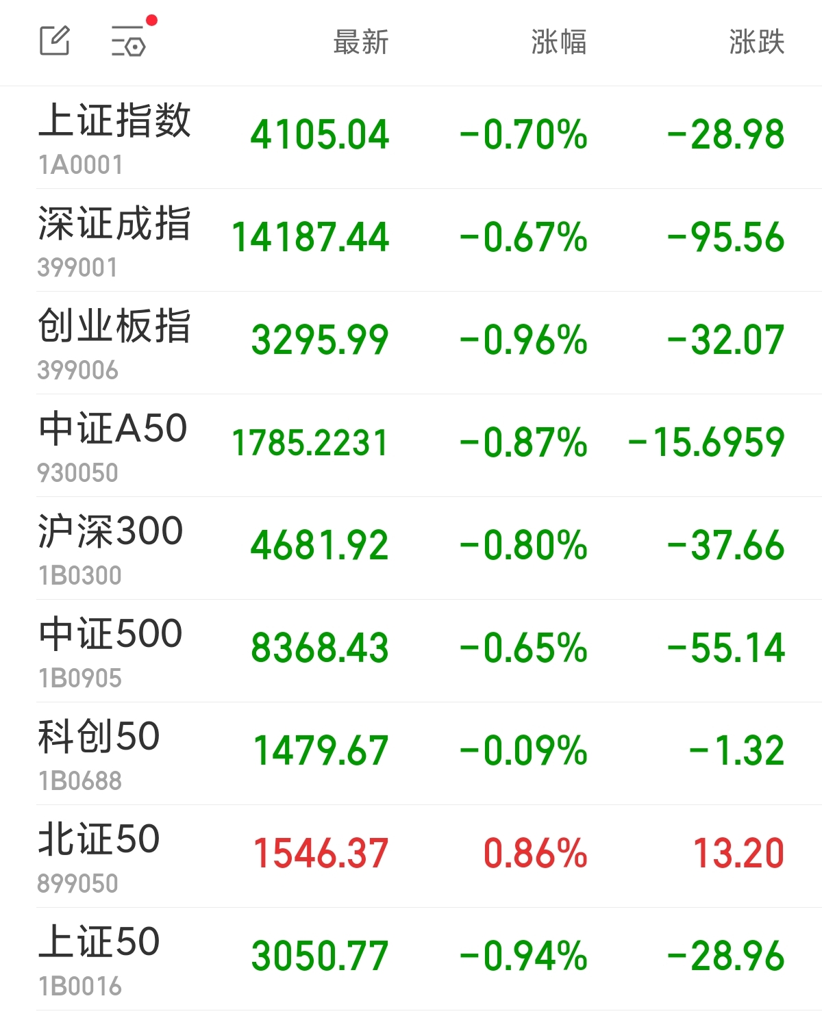 中新经纬2月13日电 周五早盘,A股三大指数低开低走。截至午间收盘,上证指数跌0.70%,报4105.04点;深证成指跌0.67%,报14187.44点;创业板指跌0.96%,报3295.99点。