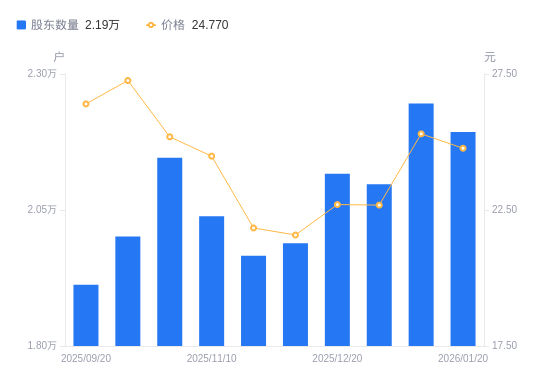 1月22日消息,数据显示,截至2026年1月20日,广大特材A股股东总户数为2.19万户,较上期(2026年1月10日)减少527户,降幅2.35%。公司最新A股总股本为2.8亿股,其中流通A股2.8亿股,户均持有流通A股数量为1.28万股,较上期增加300.09股,增幅2.40%;户均持流通A股市值31.68万元,较上期增加814.2元,增幅0.26%。
