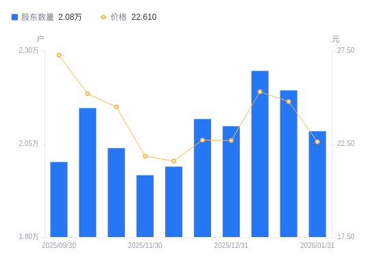 2月2日消息,数据显示,截至2026年1月31日,广大特材A股股东总户数为2.08万户,较上期(2026年1月20日)减少1093户,降幅4.98%。公司最新A股总股本为2.8亿股,其中流通A股2.8亿股,户均持有流通A股数量为1.35万股,较上期增加670.78股,增幅5.24%;户均持流通A股市值30.43万元,较上期减少1.25万元,降幅3.93%。