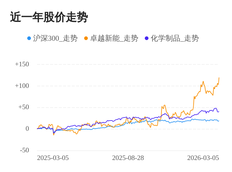 03月05日,卓越新能股价大涨。截至今日收盘,卓越新能上涨8.23%,收盘价为90.91元,收盘价创历史新高。