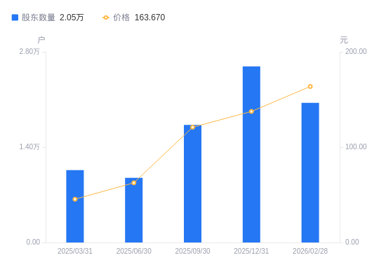 3月30日消息,数据显示,截至2026年2月28日,德科立A股股东总户数为2.05万户,较上期(2025年12月31日)减少5341户,降幅20.66%。公司最新A股总股本为1.58亿股,其中流通A股1.58亿股,户均持有流通A股数量为7716.34股,较上期增加1594.07股,增幅26.04%;户均持流通A股市值126.29万元,较上期增加42.12万元,增幅50.05%。