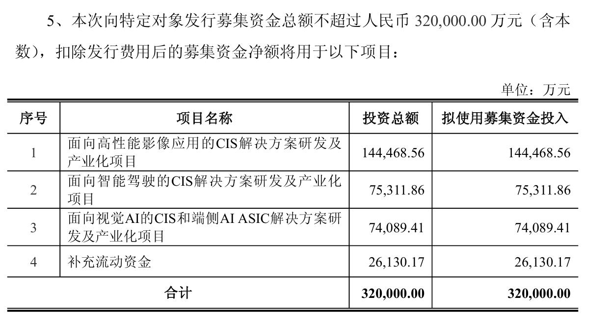 据《预案》所述,本次募集资金的14.45亿元将用于高性能影像应用的CIS解决方案研发及产业化项目,7.53亿元用于面向智能驾驶的CIS解决方案研发及产业化项目,7.41亿元用于面向视觉AI的CIS和端侧AI ASIC解决方案研发及产业化项目,2.613亿元用于补充流动资金。