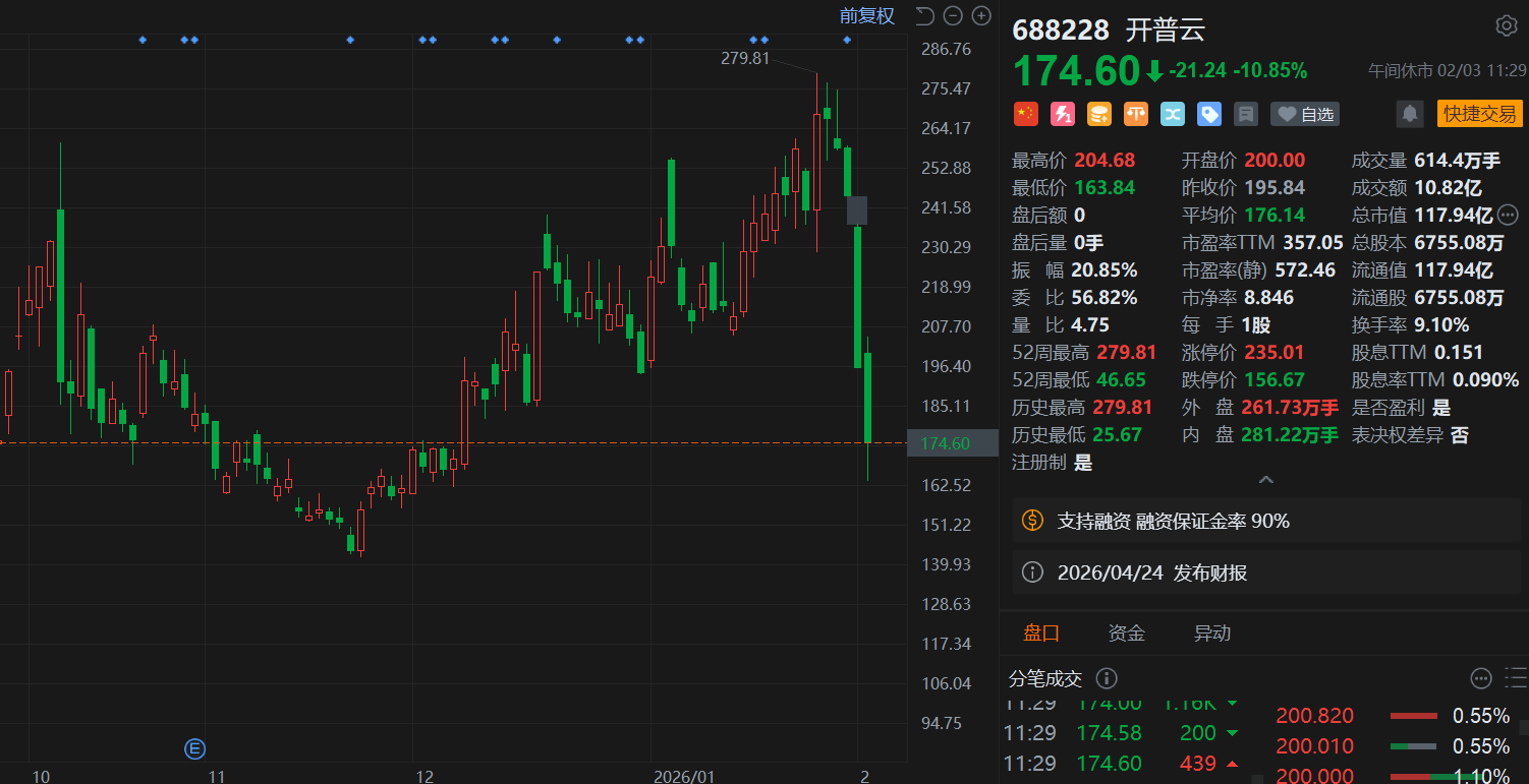 昨日20cm跌停开普云(688228.SH)再度大跌10.8%,并且录得5连跌行情,现报174.6元,总市值118亿元。消息上,开普云昨日20cm跌停,盘后龙虎榜数据显示,沪股通专用席位买入4263.05万元并卖出2239.37万元,有3家机构专用席位净卖出2.44亿元。另外,公司上周五晚公布,公司预计2025年年度实现归属于母公司所有者的净利润为-800万元至-1,200万元,与上年同期相比,将出现亏损,将减少2,859万元至3,259万元,同比下降139%至158%。
