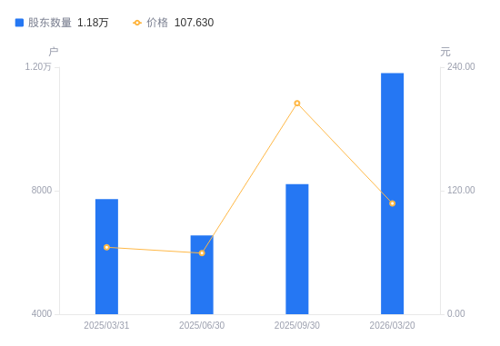 近一年(2025年3月31日至2026年3月20日),开普云A股股东户数从7727户,增加至1.18万户,增幅52.83%,区间股价上涨80.73%。