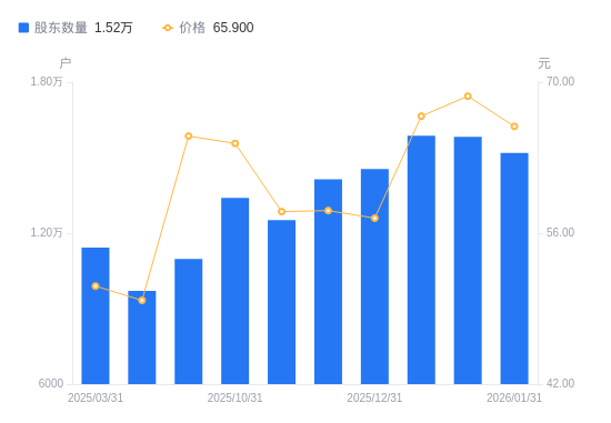 2月6日消息,数据显示,截至2025年12月31日,华特气体A股股东总户数为1.45万户,较上期(2025年12月19日)增加406户,增幅2.87%。公司最新A股总股本为1.2亿股,其中流通A股1.2亿股,户均持有流通A股数量为8265.09股,较上期减少237.31股,降幅2.79%;户均持流通A股市值47.43万元,较上期减少1.96万元,降幅3.96%。