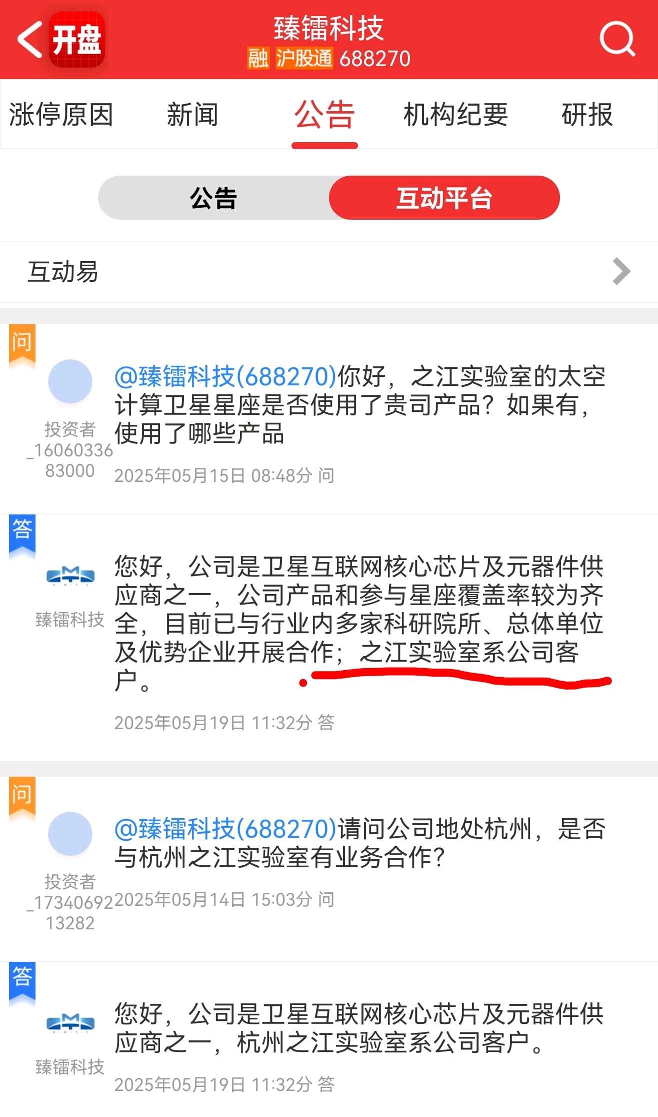 我来帮忙划一下重点。 臻镭科技在互动中明确: 之江实验室是国内太空算力的重要角色,之江实验室是臻镭科技的客户。