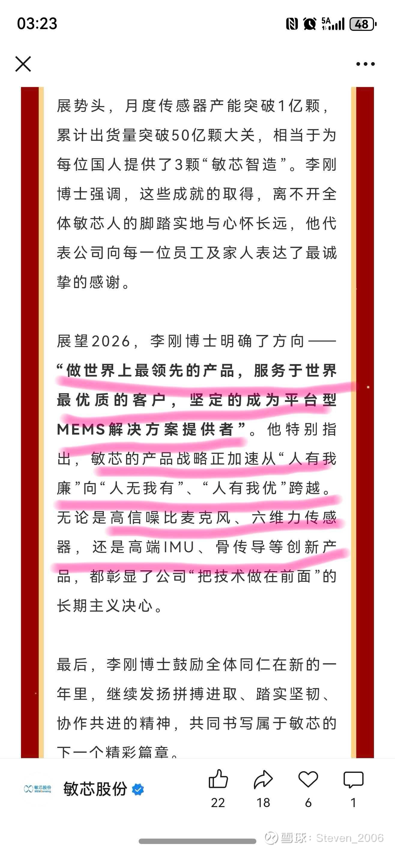 按照敏芯股份李刚博士的新年致辞,六维力传感器,高端IMU等是今年产品的重心,看产品端和市场沟通拓展方面有什么进展没有吧!