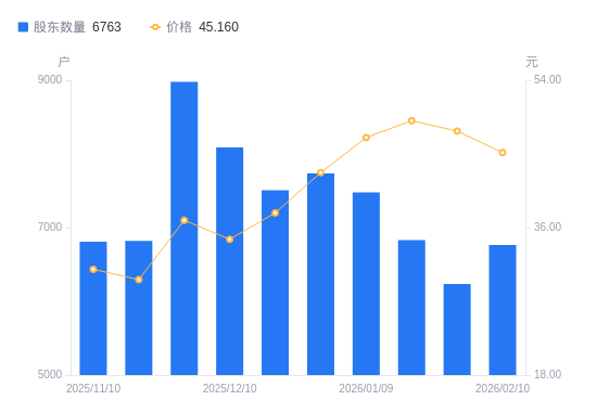 近一年(2025年2月10日至2026年2月10日),金橙子A股股东户数从4587户,增加至6763户,增幅47.44%,区间股价上涨115.71%。