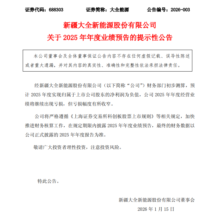 公告表示,经新疆大全新能源股份有限公司(以下简称“公司”)财务部门初步测算,预计2025年度实现归属于上市公司股东的净利润为负值,公司2025年年度经营业绩将继续出现亏损,但亏损幅度有所收窄。