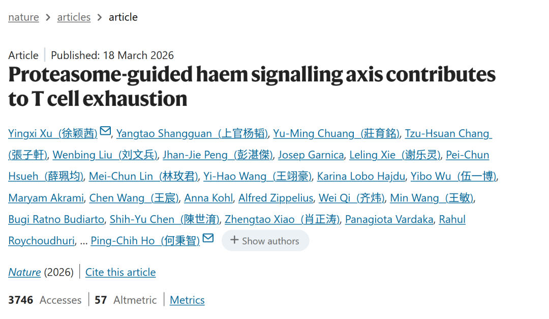 2026年3月18日,瑞士洛桑大学路德维希癌症研究中心 Ping-Chih Ho 教授与中国医学科学院血液病医院(中国医学科学院血液学研究所)王建祥教授、徐颖茜副研究员团队合作,在国际顶级期刊Nature在线发表题为Proteasome-guided haem signaling axis contributes to T cell exhaustion的研究论文,从线粒体质量控制的全新视角揭示了T细胞耗竭的分子机制——蛋白酶体引导的血红素信号轴调控CD8+T细胞耗竭的关键机制,为CAR-T疗法的优化升级提供全新靶点与转化思路。诺禾致源单细胞产品专家齐炜作为本文共同作者,深度参与从样本制备到生信分析的全流程服务支持,为研究数据可靠性打下坚实基础。