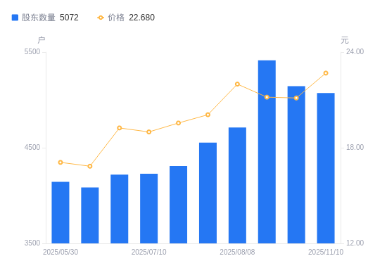 近一年(2024年12月20日至2025年11月10日),艾隆科技A股股东户数从4004户,增加至5072户,增幅26.67%,区间股价上涨41.57%。