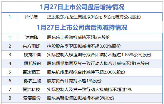 据统计,1月27日,盘后片仔癀披露增持情况。达意隆、东方雨虹、视觉中国、恒邦股份、百达精工、傲农生物、复洁科技、索菱股份等8家上市公司披露拟减持情况。